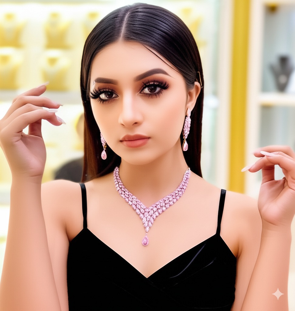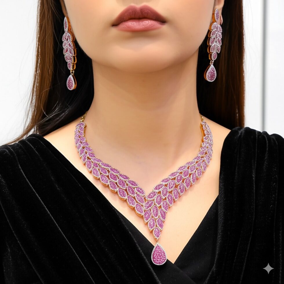 Command attention and radiate sophisticated charm with this breathtaking necklace and earring set. Masterfully crafted with clusters of high-quality American Diamonds (AD), this set dazzles in a unique and captivating wine-pink hue.
